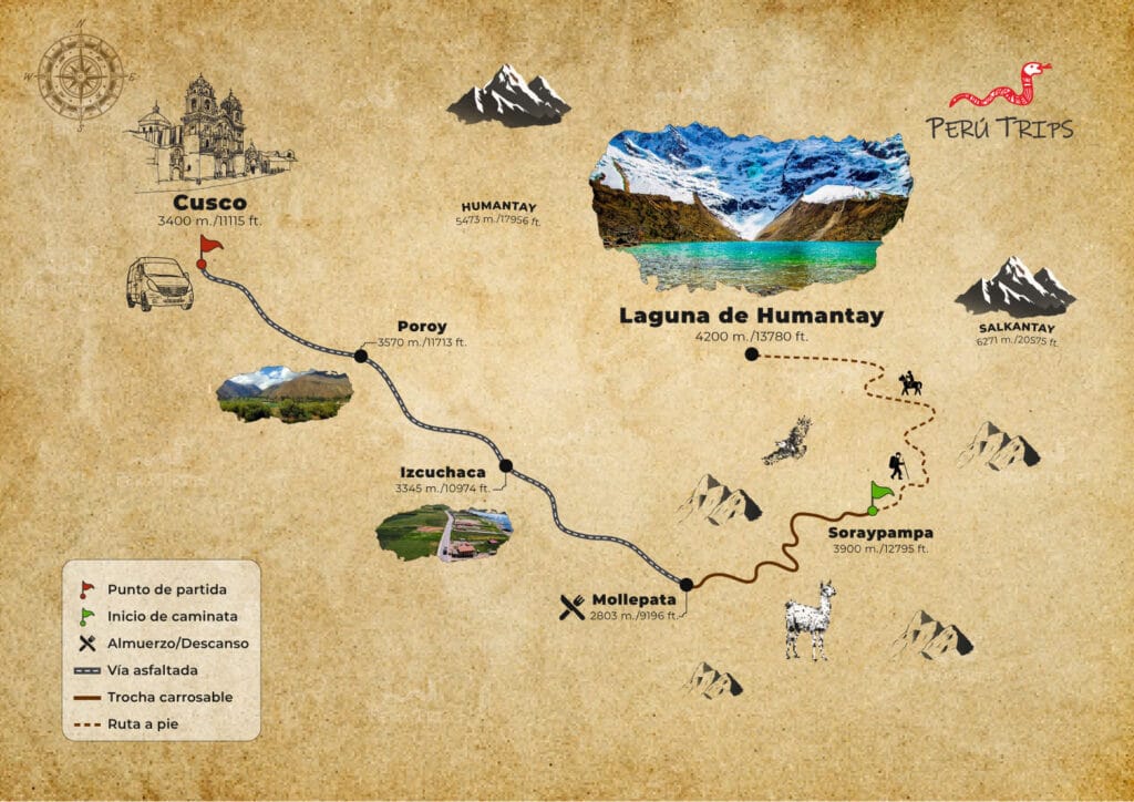 Primero el recorrido en auto toma unas 3 horas desde Cusco hasta la población de Soraypampa y desde este punto de tiene que caminar por 1 hora y 30 min aproximadamente.