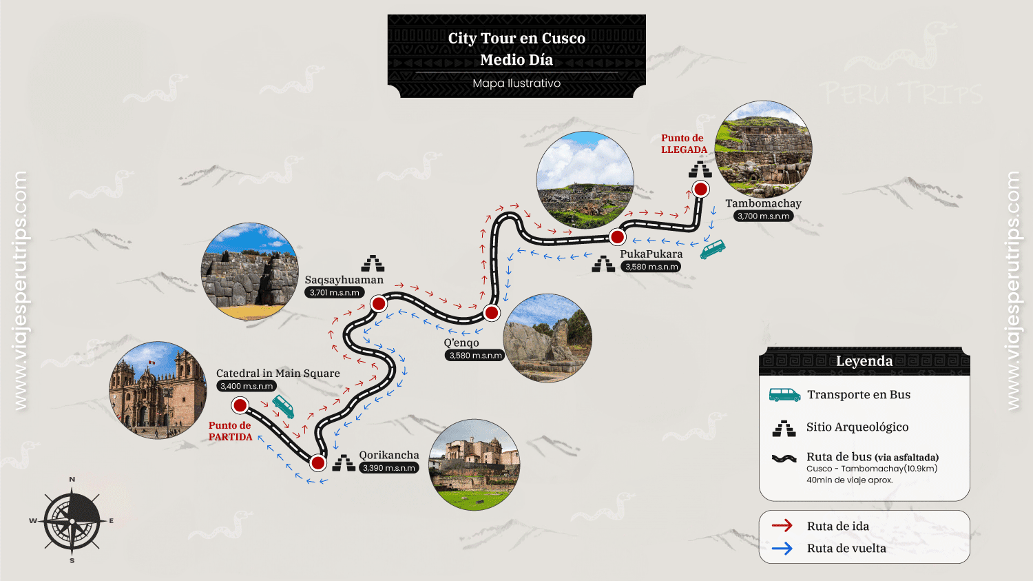 El City tour comienza, en la plaza mayor del Cusco lugar donde se reúne todo el grupo y el guía, si llegas tarde es posible que nos puedas alcanzar a la siguiente parada que es el templo del Coricancha, pero si es demasiado tarde ya habrá perdido el City tour.