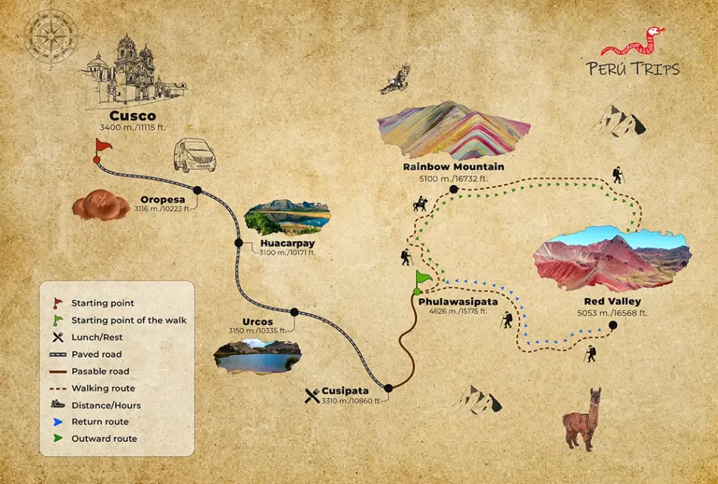 • We will walk for about 1 hour and 30 minutes until, we reach the mountain of Vinicunca also called Mountain of Colors or Rainbow Mountain, which is at an altitude of 5,036 meters above sea level, the highest point of our journey.