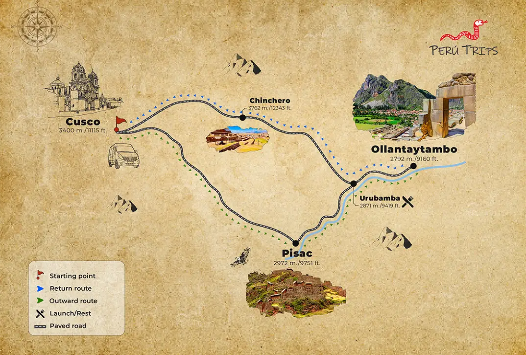 The tour duration is from 7.30 am to 6 pm, approximately 11 hours in total where you will visit places, such as: Pisac, Urubamba, Ollantaytambo and Chinchero.