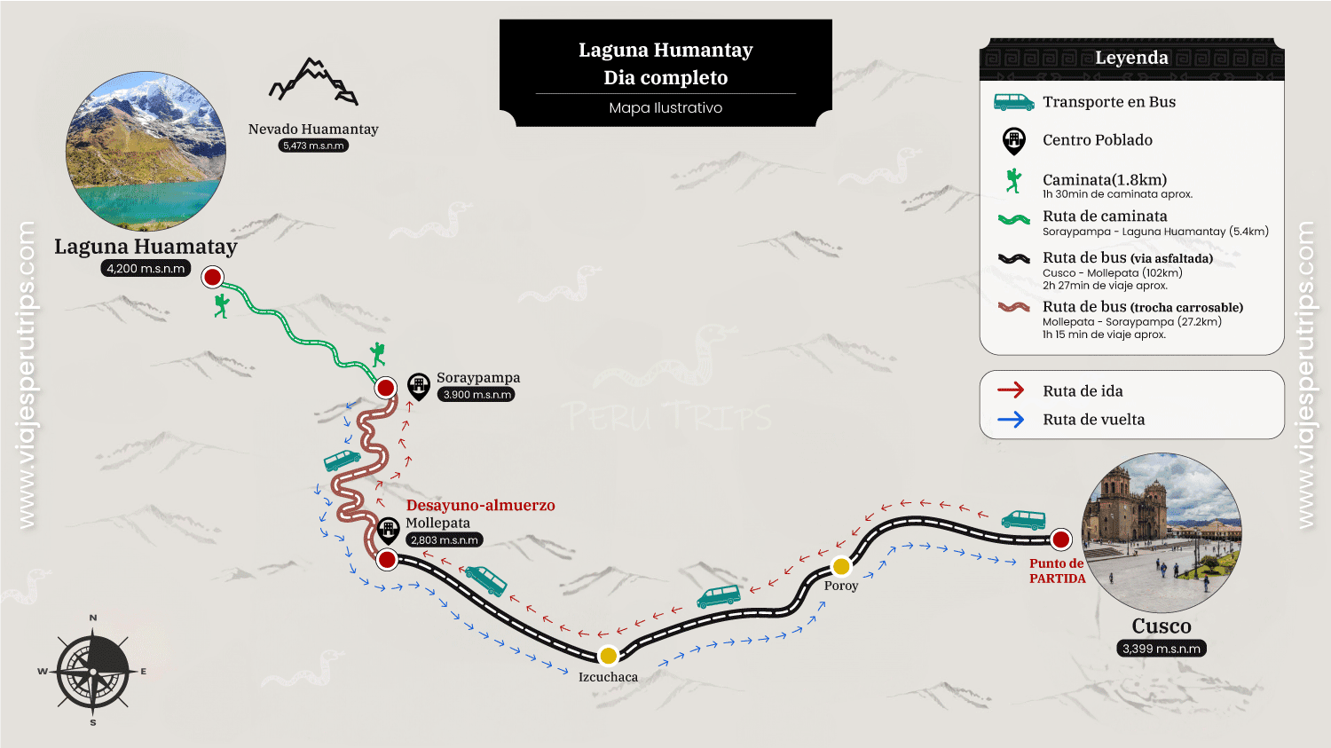 Primero el recorrido en auto toma unas 3 horas desde Cusco hasta la población de Soraypampa y desde este punto de tiene que caminar por 1 hora Y 30min aproximadamente.