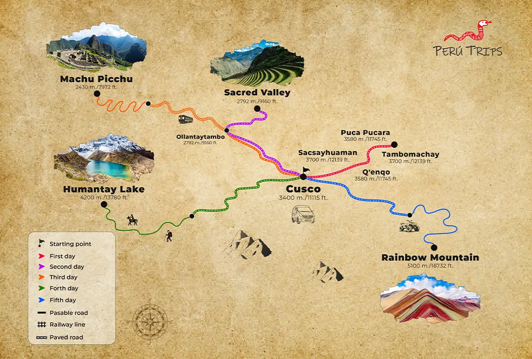 Tendrá 6 días para recorrer completamente las tierras incas, desde el primer día podrá conocer Cusco en su máximo esplendor recorriendo los sitios arqueológicos más populares de la ciudad, el segundo día los recintos arqueológicos del Valle Sagrado, posteriormente la maravilla mundial de Machu Picchu, para terminar los 2 últimos días estarán llenos de aventura visitando la laguna de Humantay y la montaña de 7 colores en Cuatrimotos.