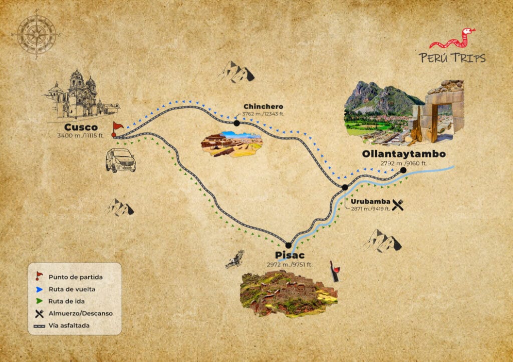 El tiempo que dura el tour es desde las 7.30 am hasta 6 pm, aproximadamente unas 11 horas en total donde se recorre lugares como: Pisac, Urubamba, Ollantaytambo y Chinchero.
