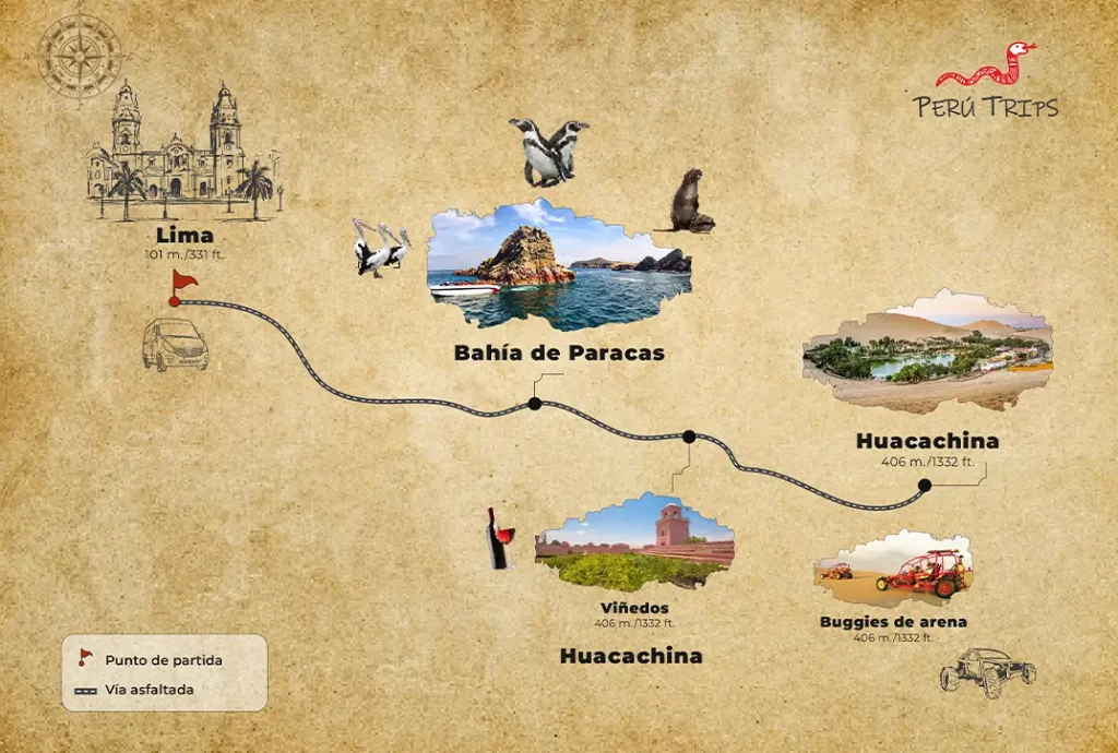 Los lugares que se visitan en este tour son la Isla Ballestas en la bahía de Paracas, los viñedos donde podrá degustar el vino y pisco peruano por ultimo el Oasis de la Huacachina, con actividades de aventura.