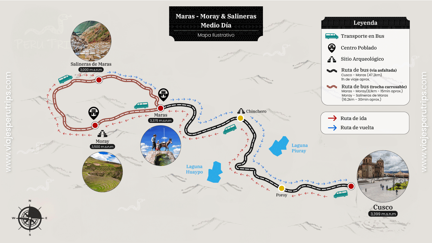 La Salinera se ubica en la provincia de Maras en el Valle Sagrado, al Noroeste a 41km aproximadamente de Cusco (3300 m.s.n.m.)